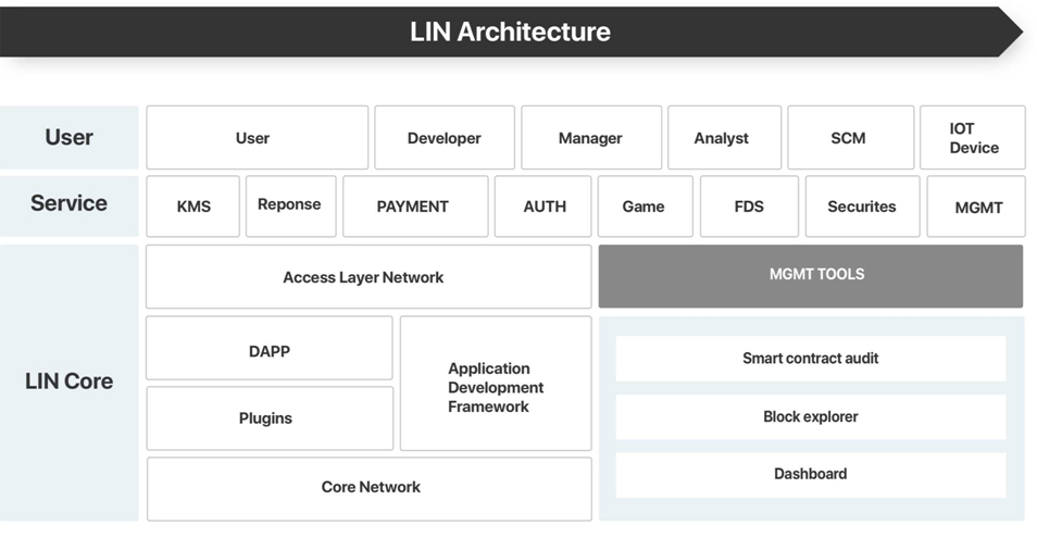 LIN Core는 블록체인 및 정보보안기술을 중심으로 메인넷, DAPP, 보안 관련 비지니스 영역을 구성함